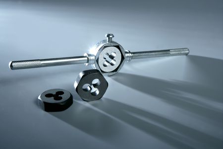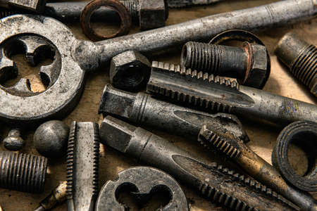 Old used kit for cutting an external thread, close up, top view, stylized, Threading dies