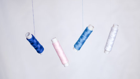 collection of various sewing threads on pastel background. each one is shot separately. knittinng tools.Natural cotton string roll isolated, copy space.Colored thread coils multi colored embroidery thread yarns.