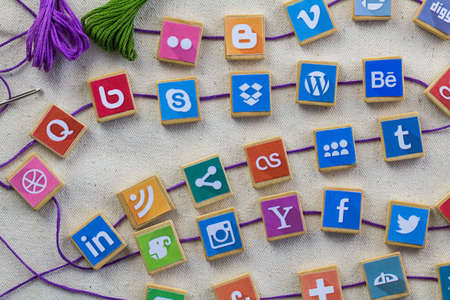 QUEENSTOWN, SOUTH AFRICA - 7 JULY 2019 -Social media background with social media logos on wooden game blocks joined with embroidery thread and needle on white linen background - Social networking concept