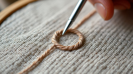 Close-up of hand embroidering twisted thread on fabric with needle. That the image is generated using AI.