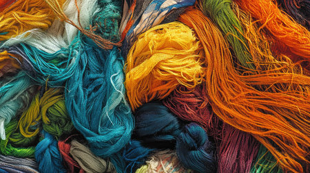A vibrant close-up image showcasing a colorful assortment of threads and fibers in a chaotic yet artistic arrangement, perfect for design and textile projects.