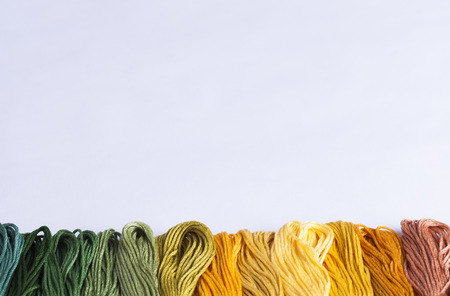 multicolored embroidery threads on white background for concepts of needlecrafts and domestic chores