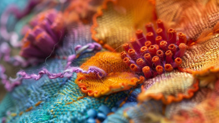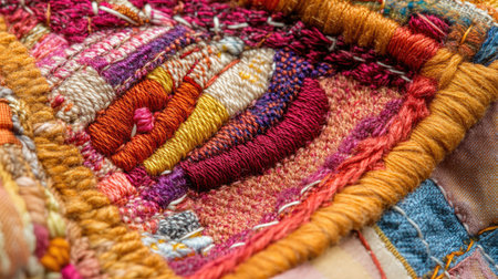 This close-up image features a stunning array of embroidery in vibrant colors, highlighting intricate patterns and textures in textile art creation.