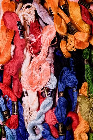 multi-colored threads for embroidery, floss, Mixed colorful texture of interlaced threads