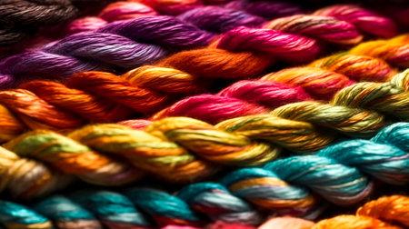 Close-up view of vibrant threads in assorted colors for crafting, showcasing detailed texture and design. Perfect for textile projects and creative art.