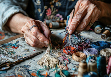 Close up of hands sorting colorful threads on a textured fabric background, showcasing intricate craftsmanship and creativity in sewing