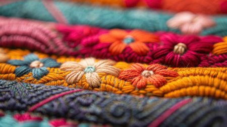 This image captures a stunning close-up of colorful floral embroidery on fabric, showcasing intricate patterns and vibrant threads. The craftsmanship highlights artistic skill and cultural traditions in textile art.