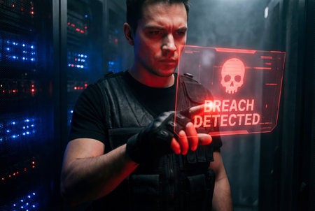 A focused cybersecurity specialist in tactical gear stands in a server room interacting with a red holographic interface displaying a skull and breach detected warning during a critical cyber attack.