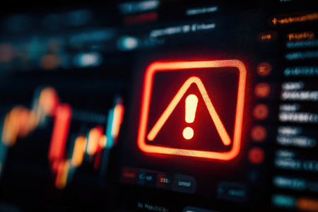 An image displays a warning icon superimposed on a data chart. The composition utilizes a shallow depth of field, with strong color contrast. The lighting suggests an artificial source, while the textures contribute to a modern aesthetic. Suitable for commercial applications such as articles on finance.