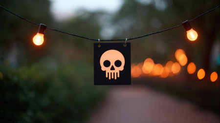 A striking skull icon on a black sign accentuates a string of warm glowing lights, creating a captivating atmosphere in an outdoor evening setting.