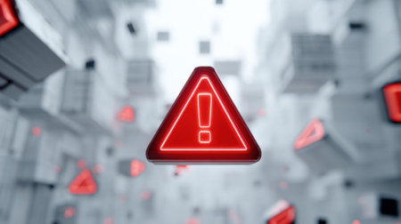 A striking visual of a warning sign illuminated in red, set against a dark background filled with hexagonal shapes, evoking a sense of urgency and caution.