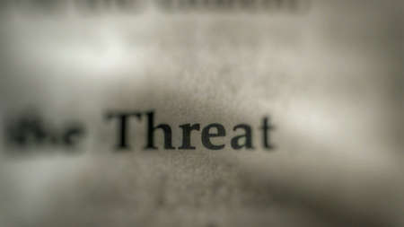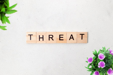 Top view of Threats word on wooden cube letter block on white background. Business concept