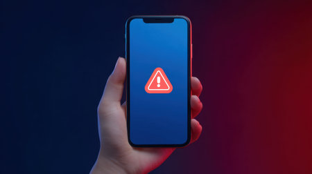 A hand holds a smartphone displaying an error alert symbol against a blue and red background, illustrating technology concerns and the impact of digital notifications on daily life.