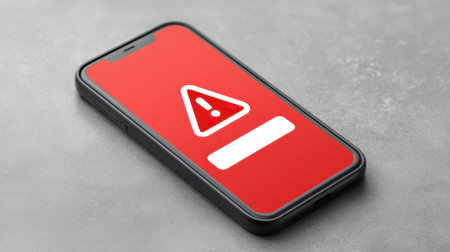An image of a smartphone showing a prominent warning alert on a red background, symbolizing urgent notifications in technology and cybersecurity topics.