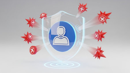 The image depicts a shield with a blue circle containing a white silhouette of a person at its center. The shield is surrounded by multiple red icons with a prohibition symbol, indicating threats. These threats are being deflected away from the shield, symbolizing protection and security.