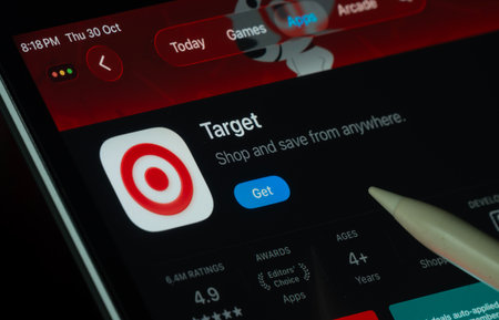 Dhaka, Bangladesh- 30 Oct 2025: Target app displayed on a iPad screen in dark mode with a digital pen pointing at it.