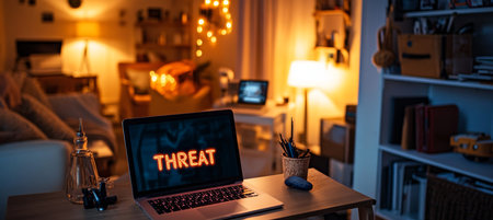 Open Laptop Displaying Glowing Neon Threat Text On Screen In Cozy Room, Cybersecurity Concept