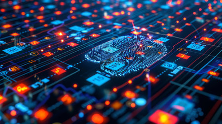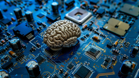 A brain model symbolizes AI technology on a circuit board, blending digital innovation and cuttingedge computing
