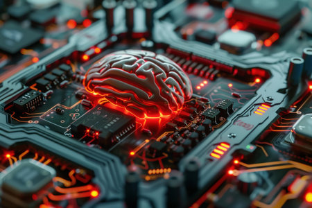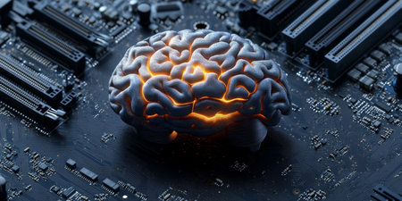 3d rendering of a human brain glowing on a motherboard, symbolizing the power and potential of artificial intelligence