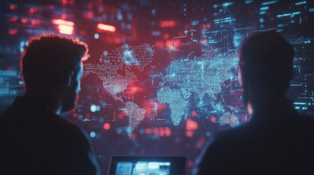 Thoughtful African American businesswoman in formal wear working on laptop. Digital interface with red map hologram, padlocks in background. Concept of cybersecurity, data protection, cyberattack