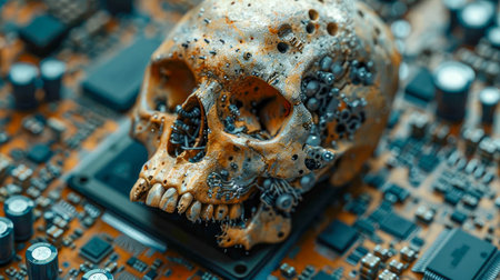 Futuristic depiction of a brain interconnected with electronic circuits on a dark circuit board. Concepts of integrated AI, brain-computer interface, and advanced technology