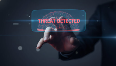 Hand reaching out and touching a futuristic holographic interface displaying a red threat detected warning, symbolizing cybersecurity concerns and data protection in a digital world