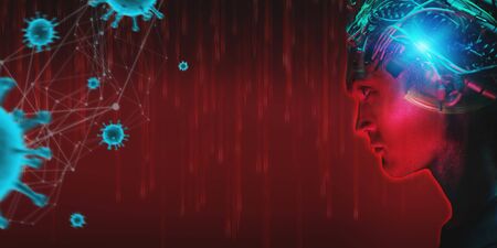 Portrait of a cyborg looking on hologram and molecules of virus over red background. Biological human robot with wires implanted in the head. Technologies of the future.