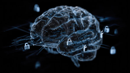 This striking 3D visualization depicts a brain intertwined with digital locks, symbolizing security and intelligence in the digital age.