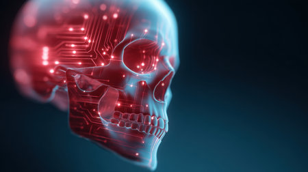 A skull with a red face and a blue background. The skull is surrounded by a glowing red light