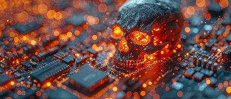 Visual representation of cybercrime hacked computer displaying skull on laptop screen