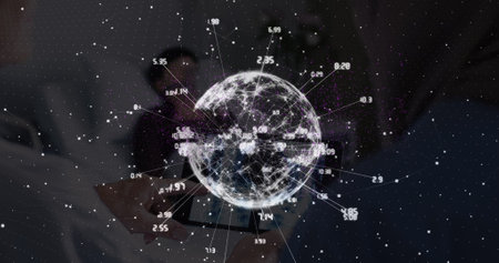Image of data processing on black background. Global business and digital interface concept digitally generated image.