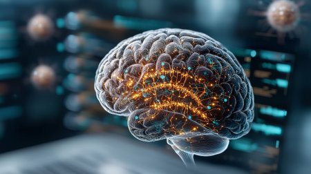 Projecting holographic brain displaying circuit traces and glowing data points in virtual space. Futuristic, technological, neural, digital, innovation, networking, cybernetic