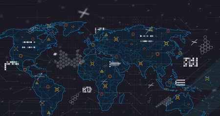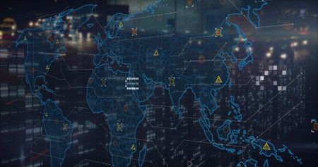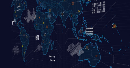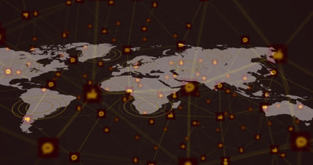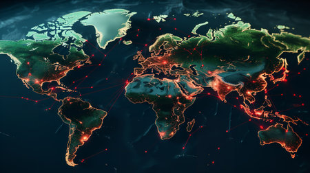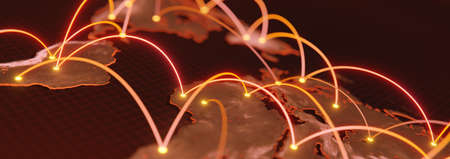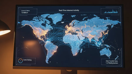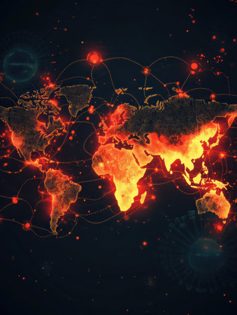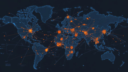 A close-up view presents an interactive world map, illustrating global data flow and internet activity. The composition highlights connected lines and illuminated regions. The color palette incorporates shades of blue and orange, creating a dynamic visual experience. Suitable for diverse editorial and commercial purposes.