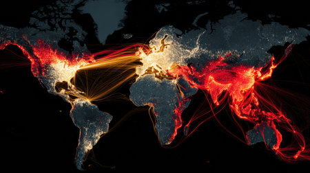 This captivating digital map displays vibrant global connectivity and data flow across continents, showcasing the intricate network of communication in a modern world.