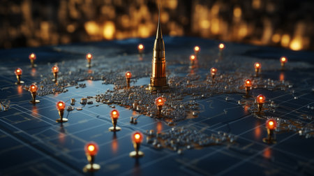 A visually stunning map that showcases the world at night, with numerous illuminated landmarks and cities, World communications network map, AI Generated