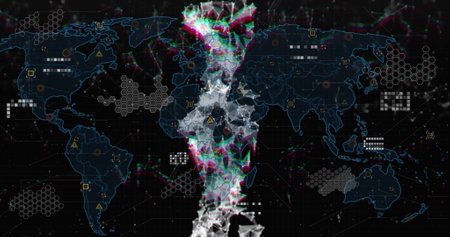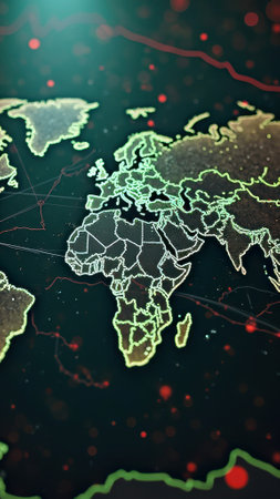 That the image is generated using AI. Digital global map with glowing borders and data points.