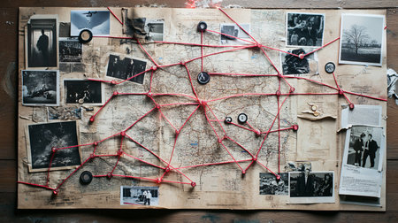 A detective-style pin and string network with photos, documents, and lines connecting them on a board.