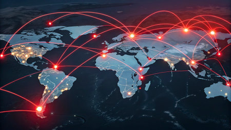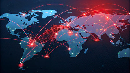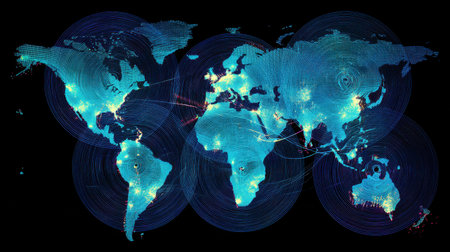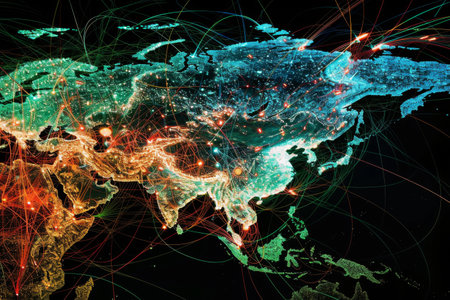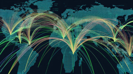 This vibrant abstract illustration showcases global connectivity and data flow, featuring bright nodes and luminous trails, emphasizing extensive information networks.