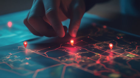 Futuristic digital hand placing markers on a map, illustrating innovative delivery methods and GPS tracking for modern logistics solutions