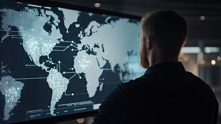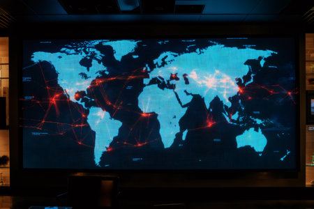 Large screen displaying a global map with highlighted data flow and connections in a dark room, ideal for technology and communication concepts