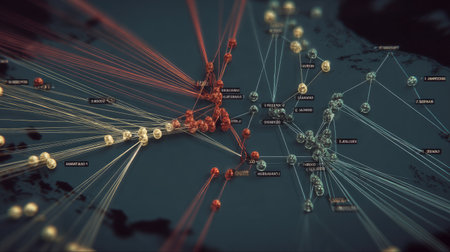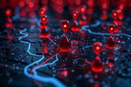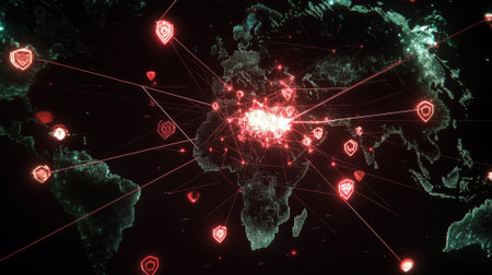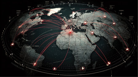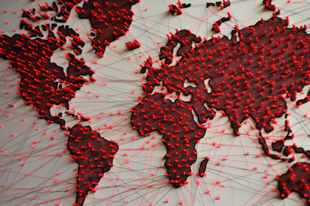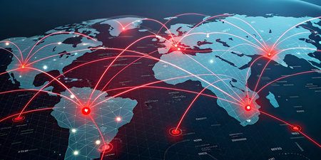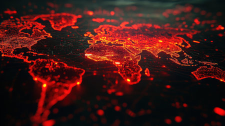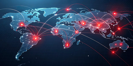 An abstract digital representation features a world map with interconnected glowing circles. Red and blue colors dominate the composition, creating a futuristic aesthetic. The image uses a low-angle perspective. Suitable for technology, data, and global communication concepts.