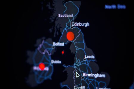 Great Britain, England, United Kingdom. Coronavirus COVID-19 global cases Map. Red Dot showing the number of infected. Johns Hopkins University map on monitor display.