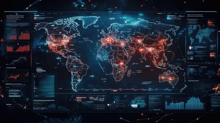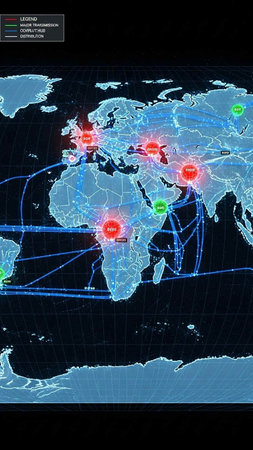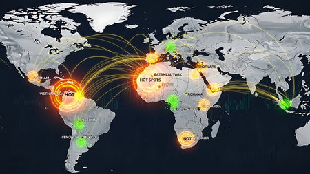 A global map shows key areas impacted by epidemic outbreaks, visualizing infection zones and connectivity trends across continents.