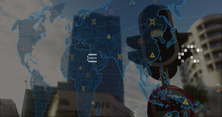 Image of world map and data processing against aerial view of cityscape. Global networking and business technology concept