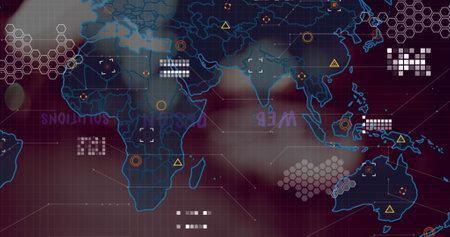 Image of data processing over world map. Global business and digital interface concept digitally generated image.