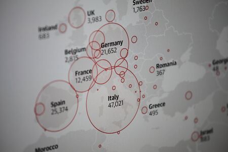 Italy, Rome, Milan. Coronavirus COVID-19 global cases Map. Red Dot showing the number of infected. Johns Hopkins University map on monitor display.