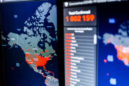 Over 1 million. Number of Total Confirmed Cases. Expert point Coronavirus COVID-19 global cases Map Johns Hopkins University map on monitor display.