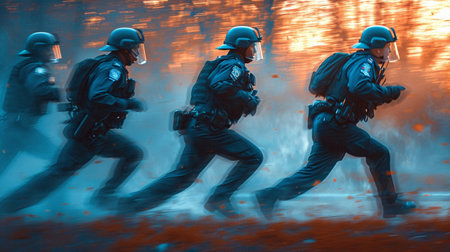 Police officers in riot gear stand ready for crowd control operation. Concept Law enforcement, Riot gear, Crowd control, Police officers, Public safety