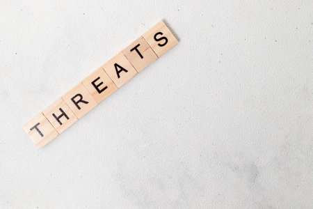 Top view of Threats word on wooden cube letter block on white background. Business concept