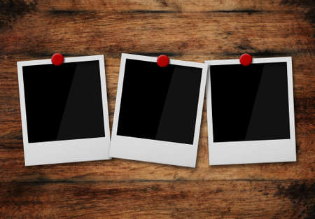 Close up three empty instant photo frames pinned on old grunge brown wooden wall background, low angle, side view